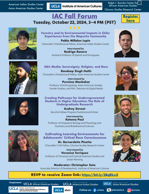 You are invited to the UCLA Institute of American Cultures (IAC) annual Fall Forum, featuring 2024–25 Chancellor’s Postdoctoral Fellows at UCLA’s four ethnic studies centers. Featured speakers will be interviewed by faculty experts, followed by a live Q&A.