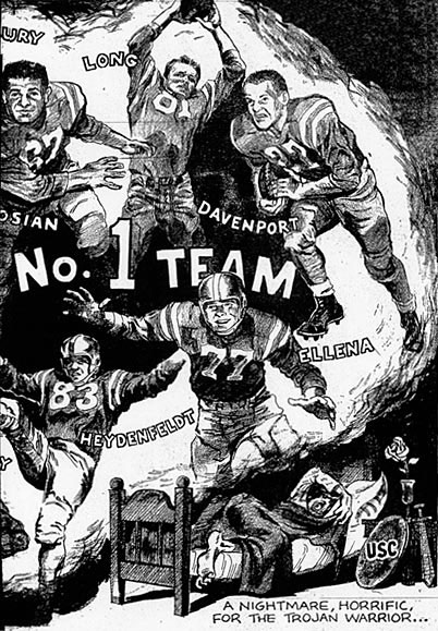 In post-game defeat, Trojan coach Jess Hill told the Daily Bruin, “They’re the best team we’ve played, but they’re not that good. I don’t know the statistics … I’ll never admit that they’re 34 points better than we.”