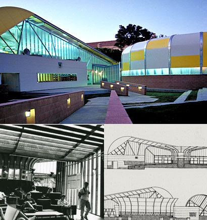 Nestled between the Men's Gymnasium (now the Student Activities Center) and the Dance Building (now Glorya Kaufman Hall) at the bottom of Janss Steps, the startling structure elicited comparisons to both a circus tent and a Martian exploration base. Husband and wife team Craig Hodgetts, UCLA associate professor, and Hsin-Ming Fung M.Arch. ’80 of Hodgetts + Fung employed a sense of playfulness in their work, while still meeting severe time constraints to complete the $3.2 million structure.